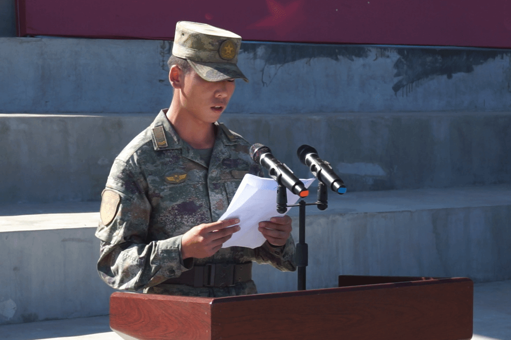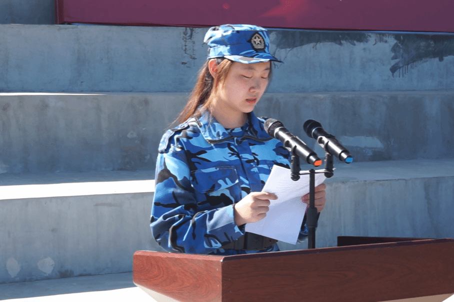 学生代表代表全体参训学生郑重承诺,将主动投入军训、积极对标看齐、严格遵守纪律、锤炼意志品质、绝不轻言放弃、展示真我风采。