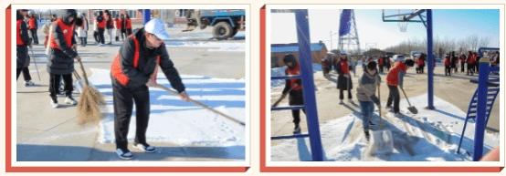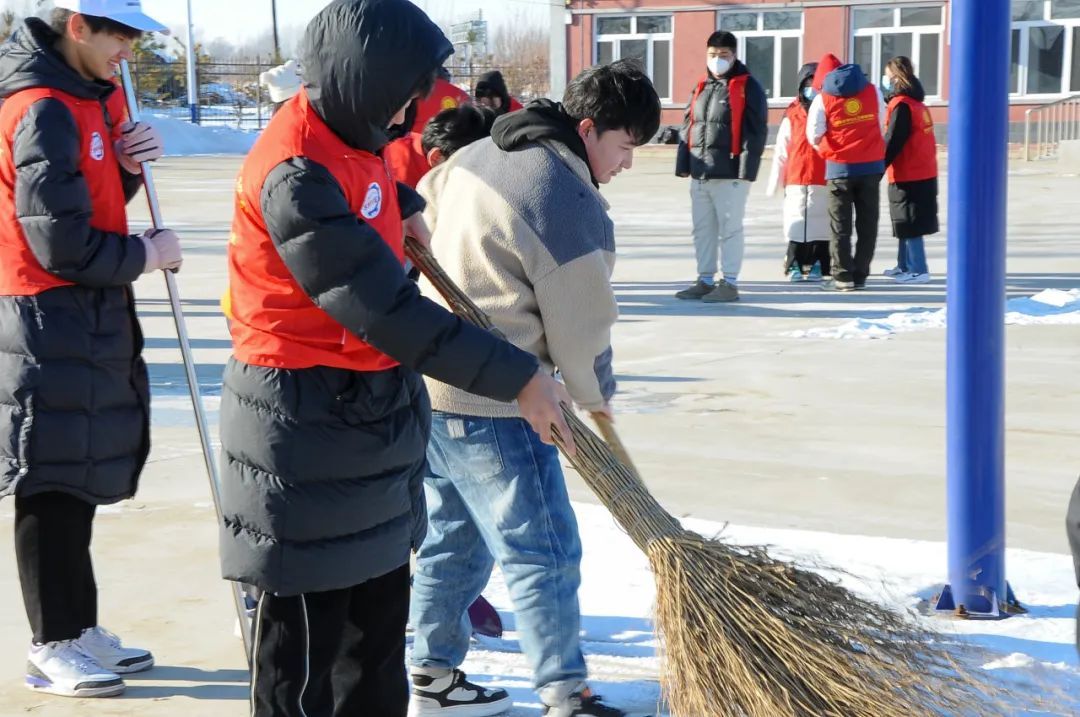 为了保障村民的出行安全,两院青年开展了除冰扫雪活动。在寒冷的环境中,同学们团结协作,干劲十足,有的挥舞铁锹,铲冰除雪,有的手持扫把,清理路面。经过一个多小时的奋力打扫,路面上的积雪情况得到了缓解,保障了村民的正常通行秩序,还大家一个安全、整洁的出行环境。同学们也在热火朝天的劳动实践中端正了思想,强化了社会责任感、使命感。