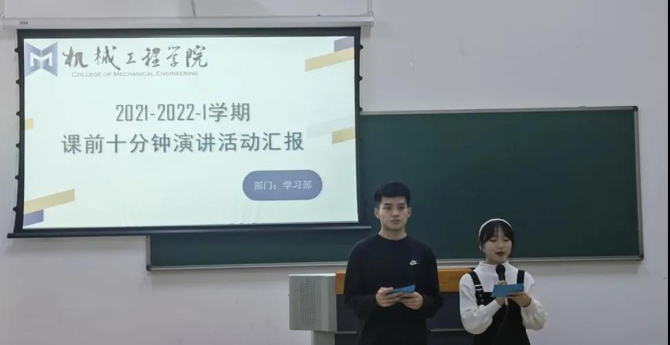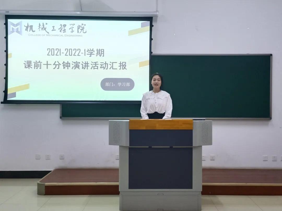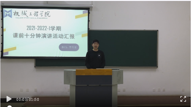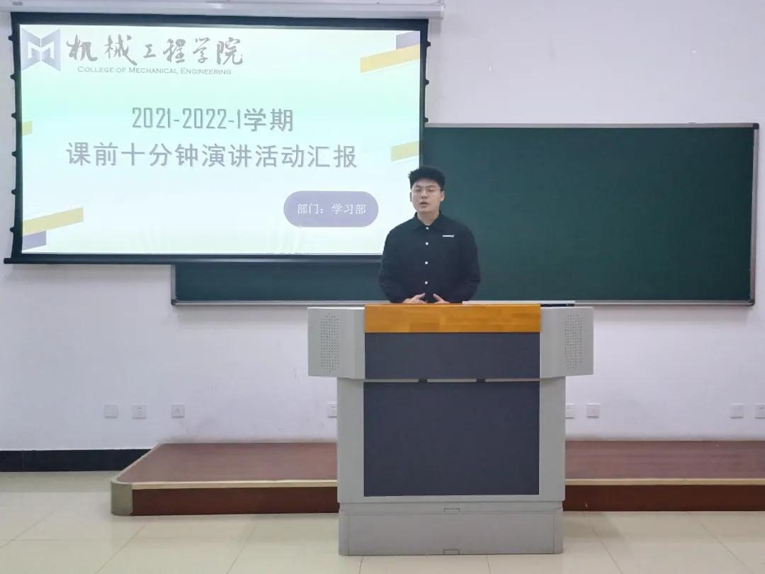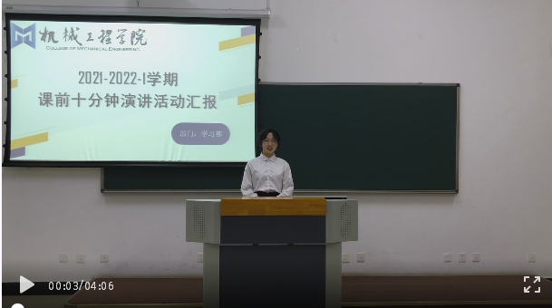 自2019年9月初,为做好机械工程学院学生思想引领工作,丰富大学生校园文化生活,机械工程学院开展课前十分钟演讲活动。以班级为单位,按照学生学号顺序依次进行演讲,活动过程由机械学习部进行实时记录,并对演讲者的班级、姓名及演讲内容进行归纳整理。活动开展以来,锻炼了同学们自我表达的能力,增强了学生的自信心。