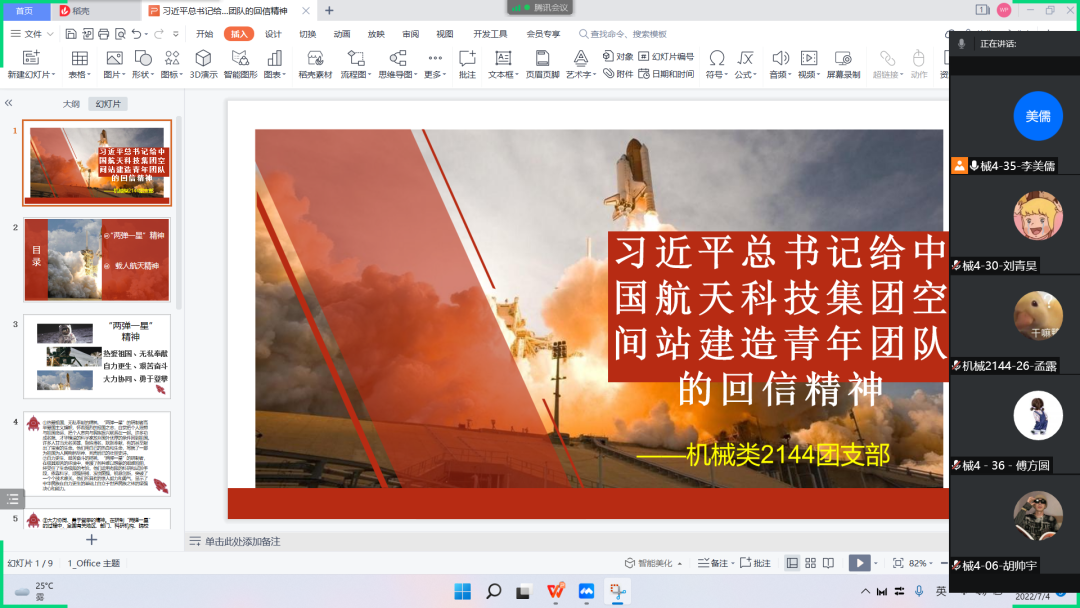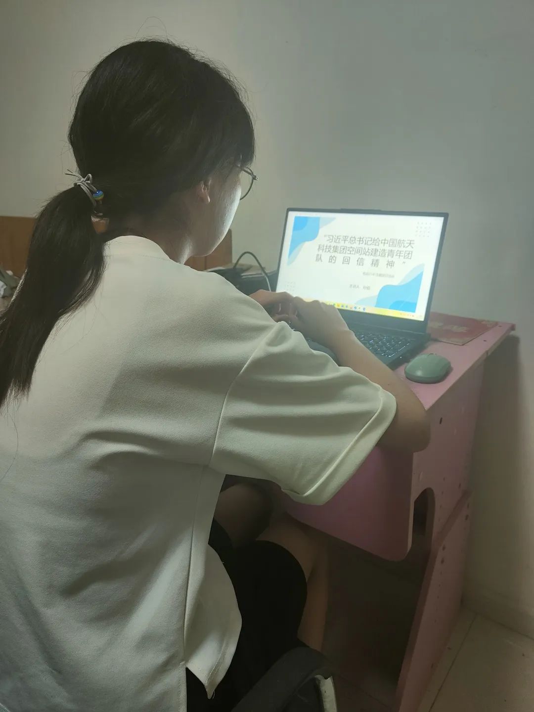 按照校团委统一部署,暑假期间以团支部为单位,通过线上会议的形式开展活动,各支部团支书带领支部成员观看相关新闻报道,阅读习近平总书记对广大航天青年的亲切勉励,一纸书信,情怀万千也力量磅礴,信中字句流露出格外的关爱,让同学们倍感亲切。在活动会议期间,同学们共同学习“两弹一星”精神、载人航天精神,并积极发表感悟、相互讨论交流。