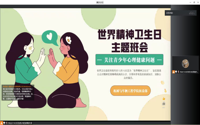此次班会通过PPT解说、视频播放、答题互动等形式对精神健康和精神卫生相关知识进行宣传。内容涵盖学生常见心理问题、心理健康判断标准、心理问题解决方法、理想信念导航等多个方面。