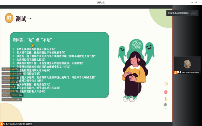 随后,主持人通过同学们评论区发送的测试结果,引导同学们了解心理健康相关知识,带领大家学习如何防治自身心理问题,以实际案例为同学们分析潜在原因并提出解决途径与办法。