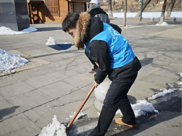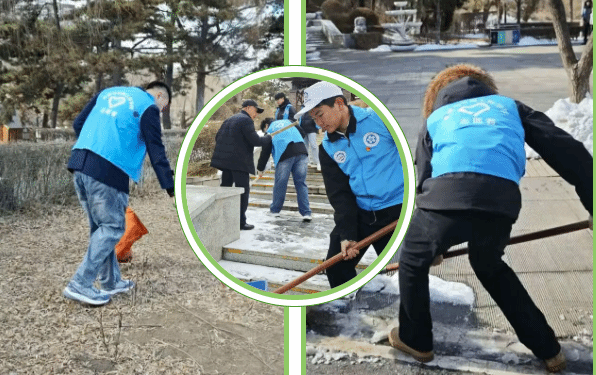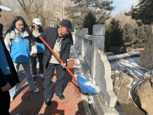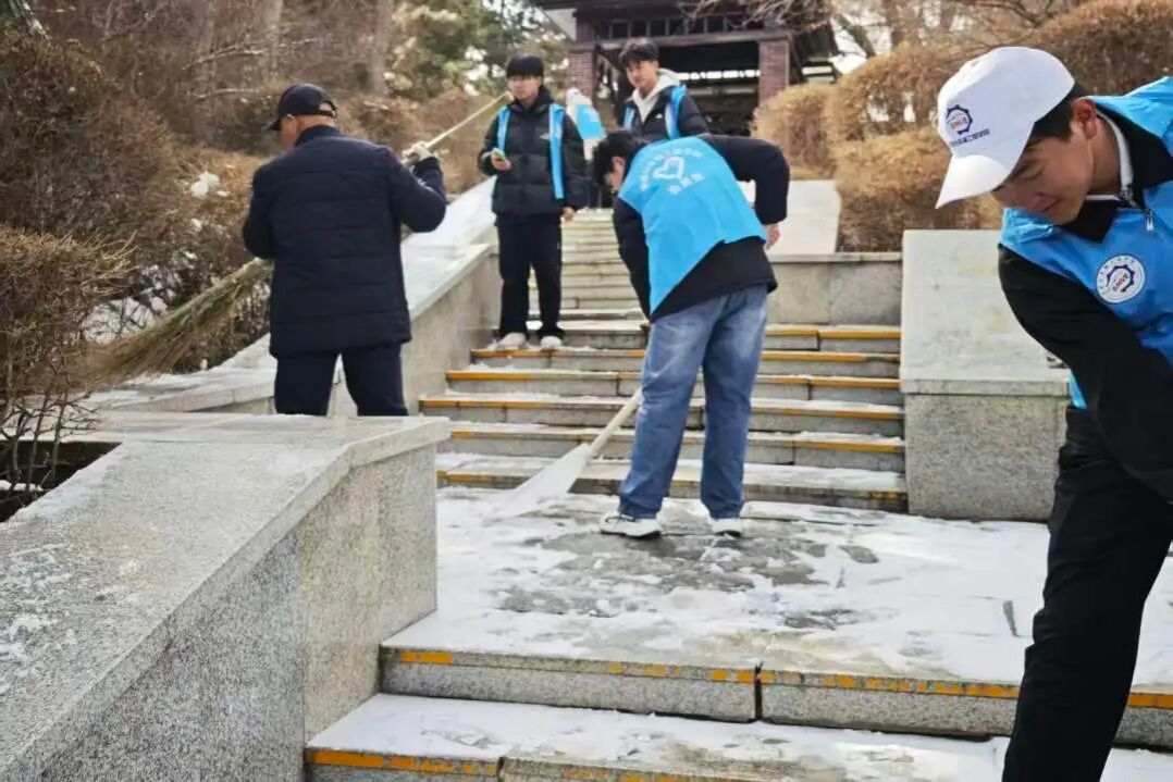 活动现场,同学们统一着装,团结协作,在胜利公园有序开展志愿服务。大家分工配合,细致清理园区步道残留的积雪积冰,消除路面湿滑隐患,同时对园区公共区域、绿化带内的杂物进行清扫。