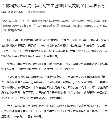 东亚经贸新闻报道”吉林科技活动周机械学院大学生创业团队发明全自动刷鞋机