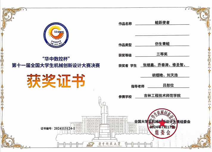 在本次比赛中,yl6809永利集团通过校内选拔赛推荐了19项作品参加省赛。经过评委们的严格评审和激烈竞争,学院取得了令人瞩目的成绩,共获得特等奖2项、一等奖4项、二等奖5项、三等奖8项。其中,吕恕位、谷占斌老师指导的作品脱颖而出,获得2项特等奖,代表吉林省参加了全国决赛。最终,吕恕位老师指导的作品“仿生青蛙—蛙跃使者”在全国决赛中荣获国家三等奖,图1为获奖证书和作品。此外,学校还荣获了“优秀组织奖”,这一殊荣彰显了我校在机械创新领域的实力以及对学生培养的重视,充分展示了我校学生的创新思维和工程实践能力。在省赛期间,学院毛春昱副院长全程指导并参与了比赛,由刘锋老师带队,朱秀荣、吴晓慧、谷占斌三位老师也到场进行学习和交流。