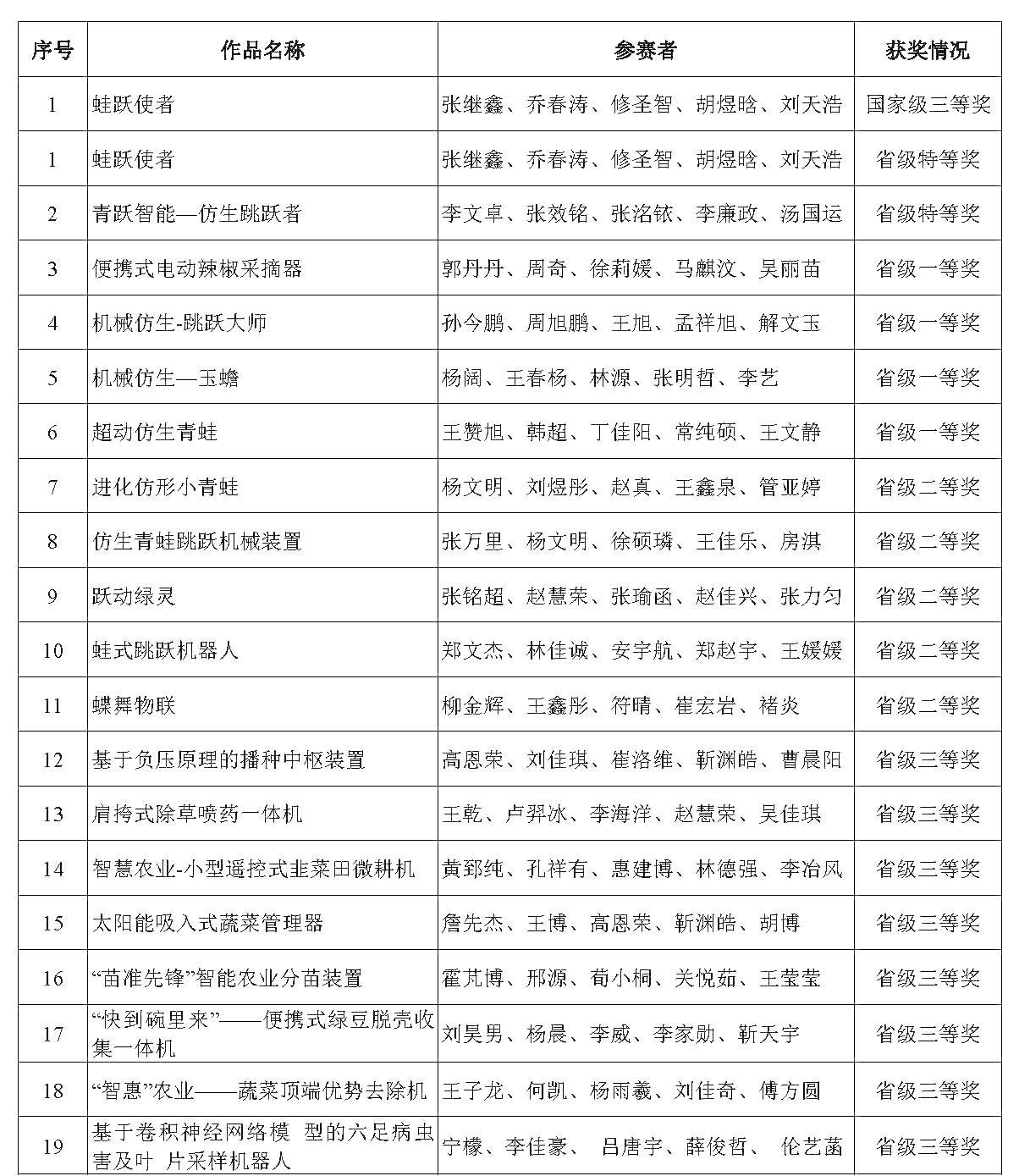具体获奖名单如下表