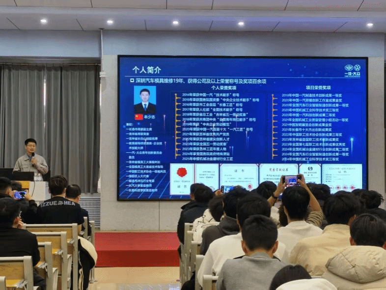讲座中,牟少志结合19年深耕模具维修一线经历,从成长、淬炼、传承等多个维度分享经验。他以“追光”为主线,回顾了从农村少年成长为行业专家的逐梦历程,以及进入一汽-大众后,用极致追求攻克工艺难题的职场经历。针对技术创新,他以模具数字化转型实践为例,分享模具氮气缸无线压力数字化监控系统行业首创技术,在解决多项关键技术难题的同时,赢得国际同行高度认可。围绕人才培养,他阐述了国家级技能大师工作室“实践出真知”的真谛,结合高技能人才应具备的14种基本素质,为青年学子的成长发展指明道路。