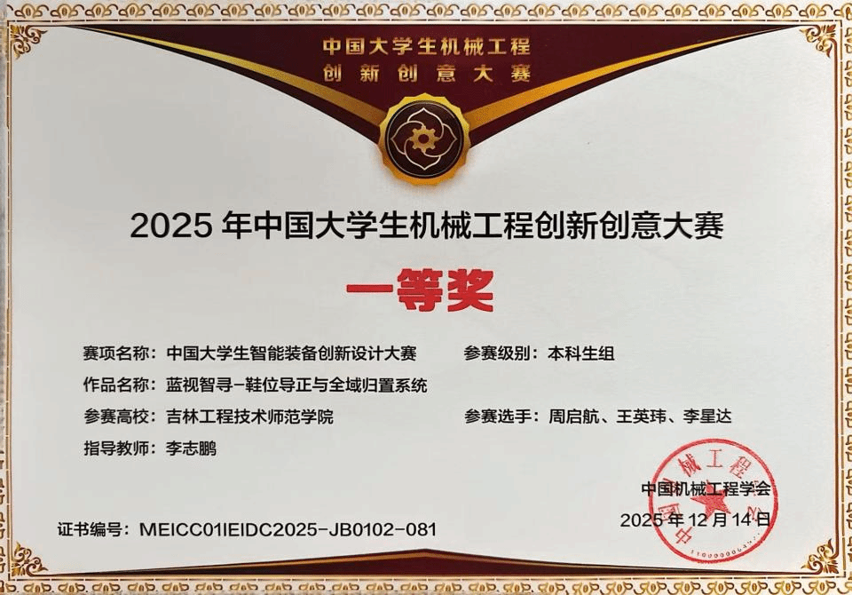 近年来,我院紧跟新工科建设步伐,深化跨学科融合培养模式,推进智能装备领域教学改革与实践育人工作,搭建创新实践平台,引导学生融合机械、车辆、自动化、电子信息、人工智能等多学科知识,培养创新精神与跨界整合能力。此次获奖是对我校学子专业能力的肯定,也是人才培养质量提升的生动体现。未来,我校将持续深耕创新人才培养,为机械、车辆等产业发展输送更多高素质复合型人才。