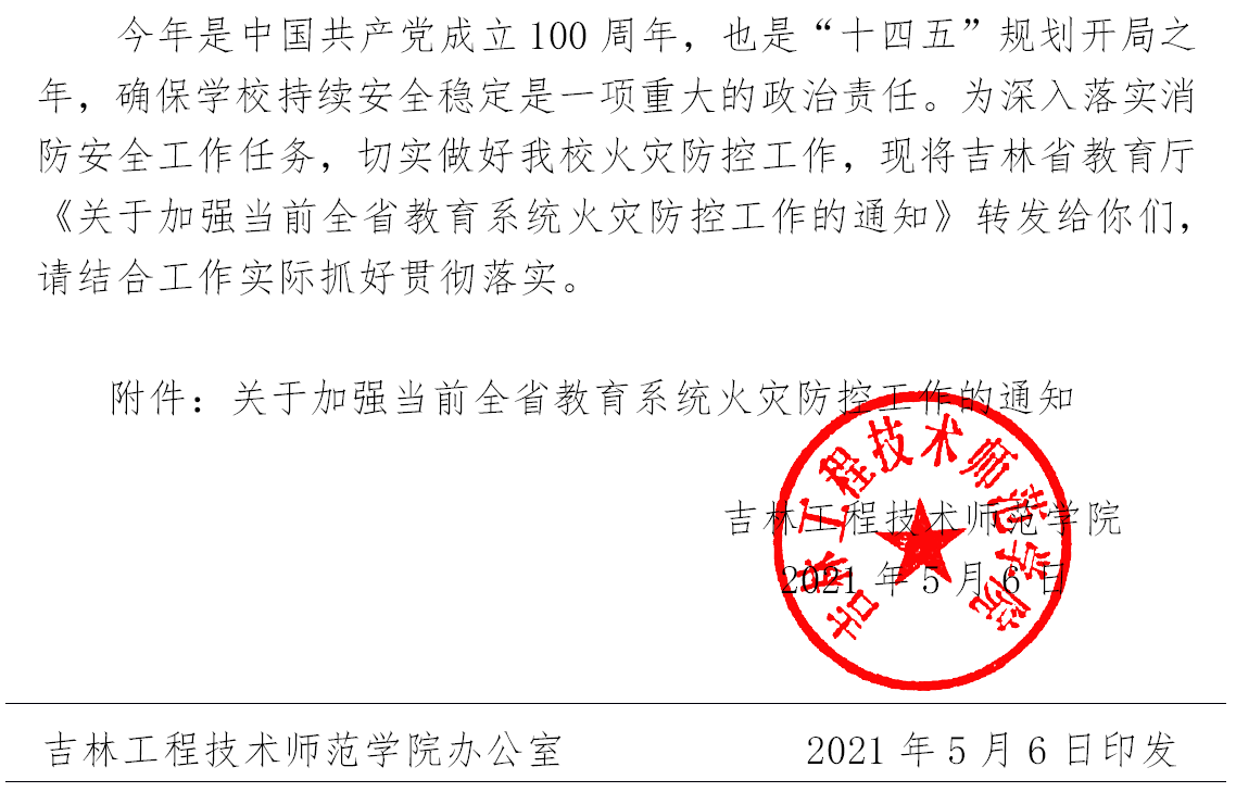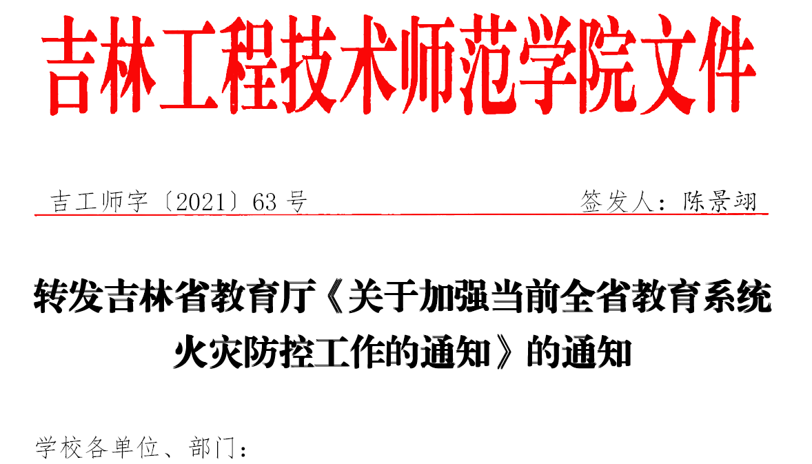 吉工师字〔2021〕63号 转发吉林省教育厅《关于加强当前全省教育系统火灾防控工作的通知》的通知