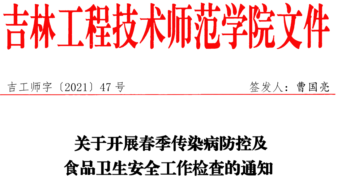 根据新冠疫情防控常态化工作的总体要求,为了进一步做好学校春季传染病防控及食品卫生安全工作,有效地预防和控制各类传染病及群体性食物中毒等事件的发生,按照《永利官方网站传染病防控工作预案》(吉工师字〔2019〕205 号)和《永利官方网站食品安全突发事件应急处置预案》〔2019〕206 号)文件要求,结合学校具体工作实际,决定在全校开展春季传染病防控及食品卫生安全工作检查活动,具体通知如下: