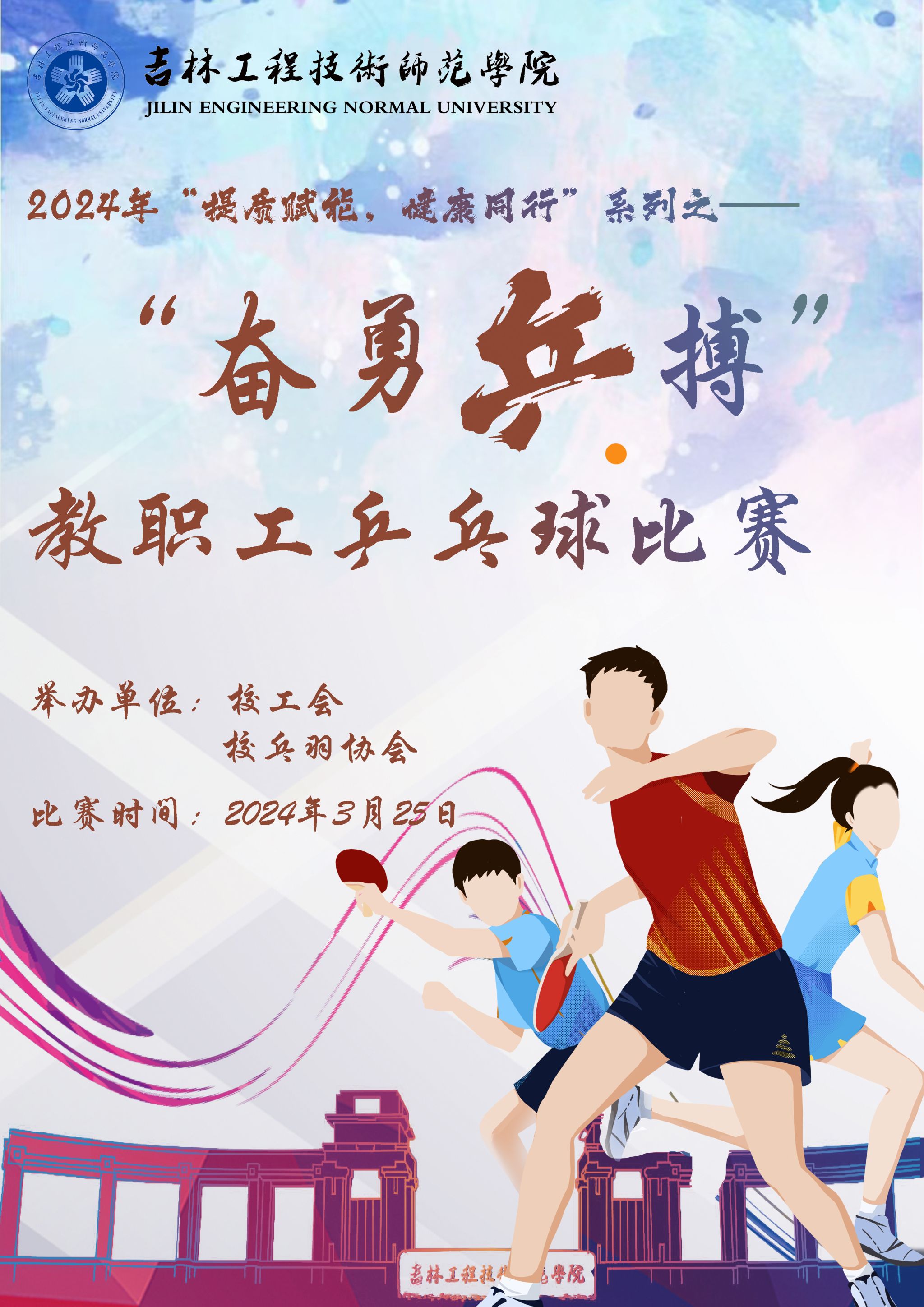 一、学校2024年“奋勇乒搏 ”教职工乒乓球比赛3月25日(周一)正式开赛,比赛地点为凯旋校区体育馆、长德校区机械实训中心,比赛时间为中午11:50至12:50,请报名选手准时到场,开赛后未能进入场地按弃权处理。