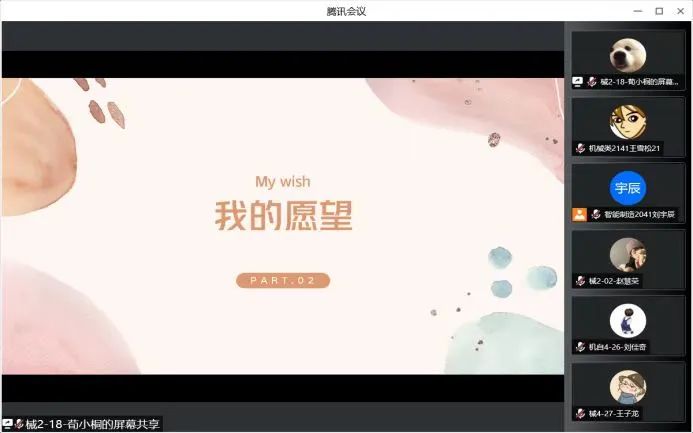 第二环节“我的愿望”,此环节在主持人的带领下,同学们围绕“我在家里,没能来学校上学有什么遗憾?”“我在家里,有什么意外的收获或者发现?”以及“回到学校如果可以做一件小事弥补我的遗憾,我会做什么?”这三个问题进行深入思考,回答的过程进一步抒发了同学心中的遗憾与渴求。