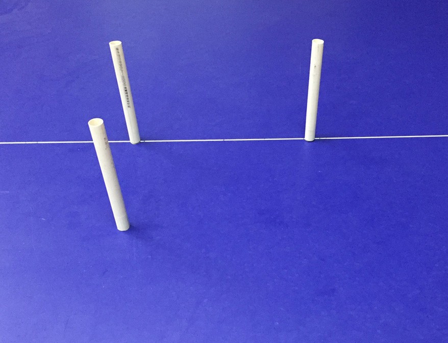 竞赛场地在半张标准乒乓球台(长1525mm、宽1370mm)上,有3个障碍成“L”形放置, “L”形的长边在球台的中线上,(放置球台时“L”形的长边平行主看台方向,短边垂直且远离主看台),经现场公开抽签,在400~500mm范围内产生“L”形的长边值,在300±50mm范围内产生“L”形的短边值。