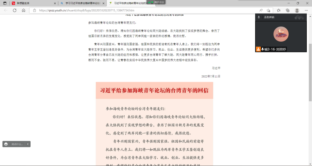 按照校团委统一部署,学院组织团员青年以团支部为单位,采用线上形式组织化开展、系统化学习。各班团支书带领观看相关新闻报道,随后,同学们分别围绕“习近平主席致世界青年发展论坛贺信精神”、“习近平给参加海峡青年论坛的台湾青年的回信精神”进行了深入交流。