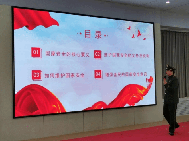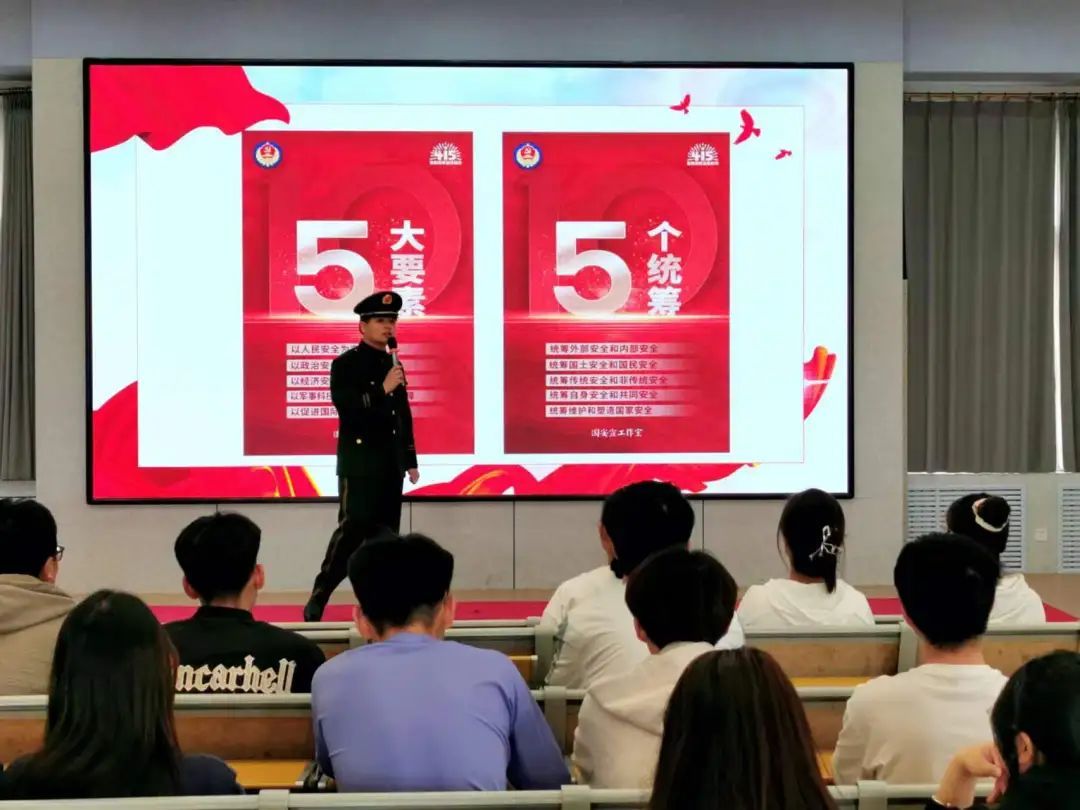 柳金辉以“维护国家安全,建设和谐校园”为主题从国家安全的核心要义、维护国家安全的义务及权利、如何维护国家安全与增强全民的国家安全意识,4个方面对国家安全相关知识进行讲解。陈述了“国安宣工作室”发布的“总体国家安全观,创新引领10周年”官宣海报展示的总体国家安全观五大要素,五个统筹、总体国家安全观核心要义集中体现的“十个坚持”与国家安全涉及的20个重点领域。根据《宪法》第五十一条至五十五条规定、《国家安全法》第七十七条规定讲解公民维护国家安全的义务与权利;介绍了在日常生活中应警惕的危害国家安全的活动与12339热线,提醒大家在遇到危害国家安全的行为需要及时拨打12339。